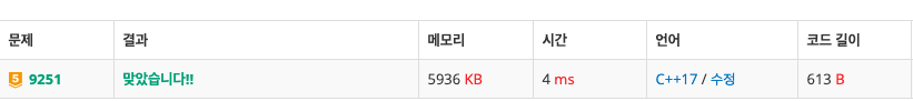 문자 a[i-1], 문자 b[j-1] 가 같을 때 dp[i][j] = dp[i-1][j-1] + 1을 하여